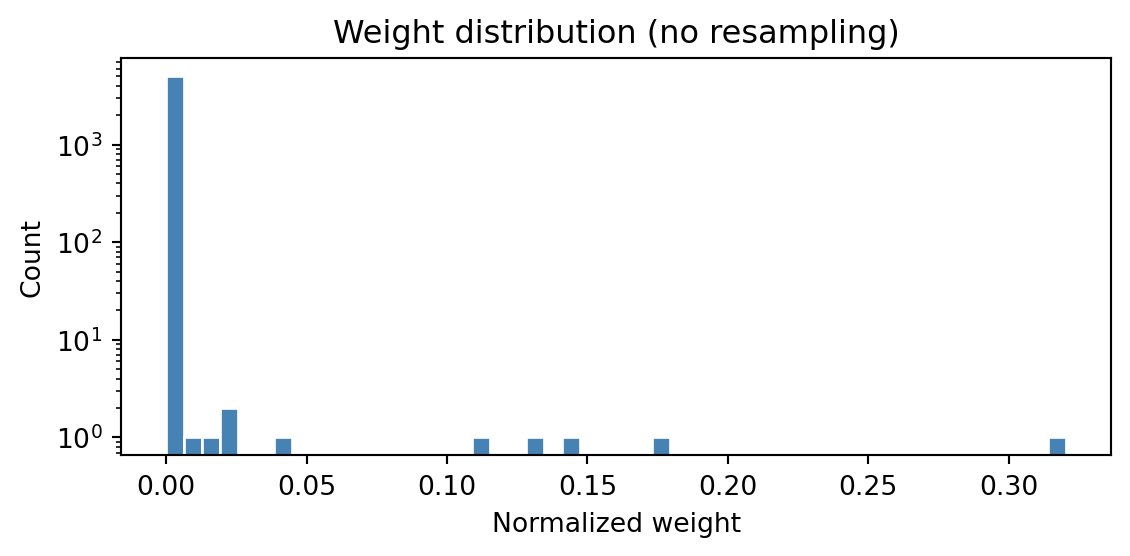 result.log_weights— log-weights accumulated fromobservecalls, shape \((N,)\).result.norm_weights— normalized weights (i.e.softmaxoflog_weights), shape \((N,)\). These sum to \(1\) and are convenient for computing weighted averages or plotting.result.log_evidence— estimate of \(\log p(\text{observations})\), useful for model comparison.