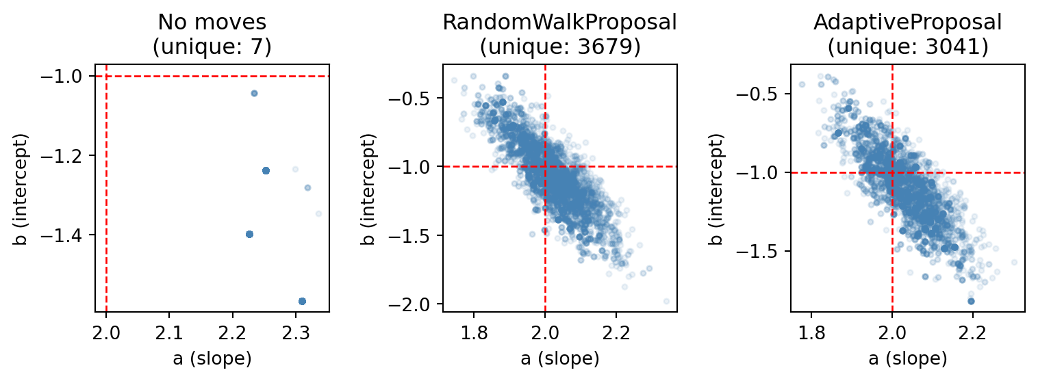 The AdaptiveProposal estimates the weighted covariance of the targeted variables from the current particles, scales it using a factor of \(2.38 / \sqrt{d}\) (optimal for Gaussian targets), and adds a small ridge for numerical stability. This generally works well without manual tuning..