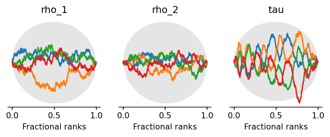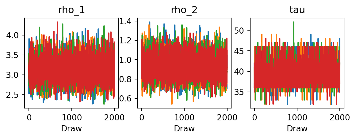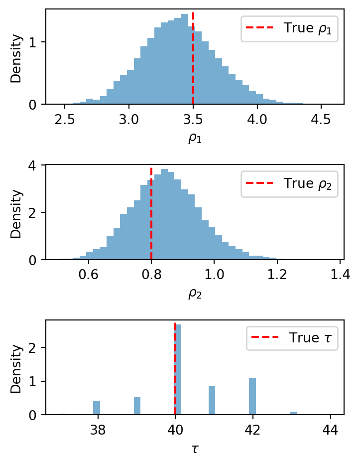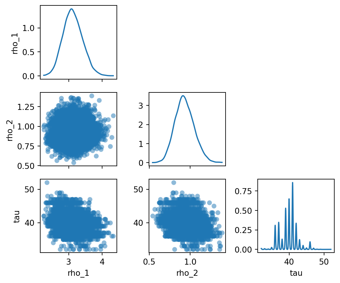 Priors. The first three numpyro.sample calls draw the unknown quantities \(\rho_1\), \(\rho_2\), and \(\tau\) from their prior distributions. Each call returns a JAX scalar that we can use in subsequent computation.