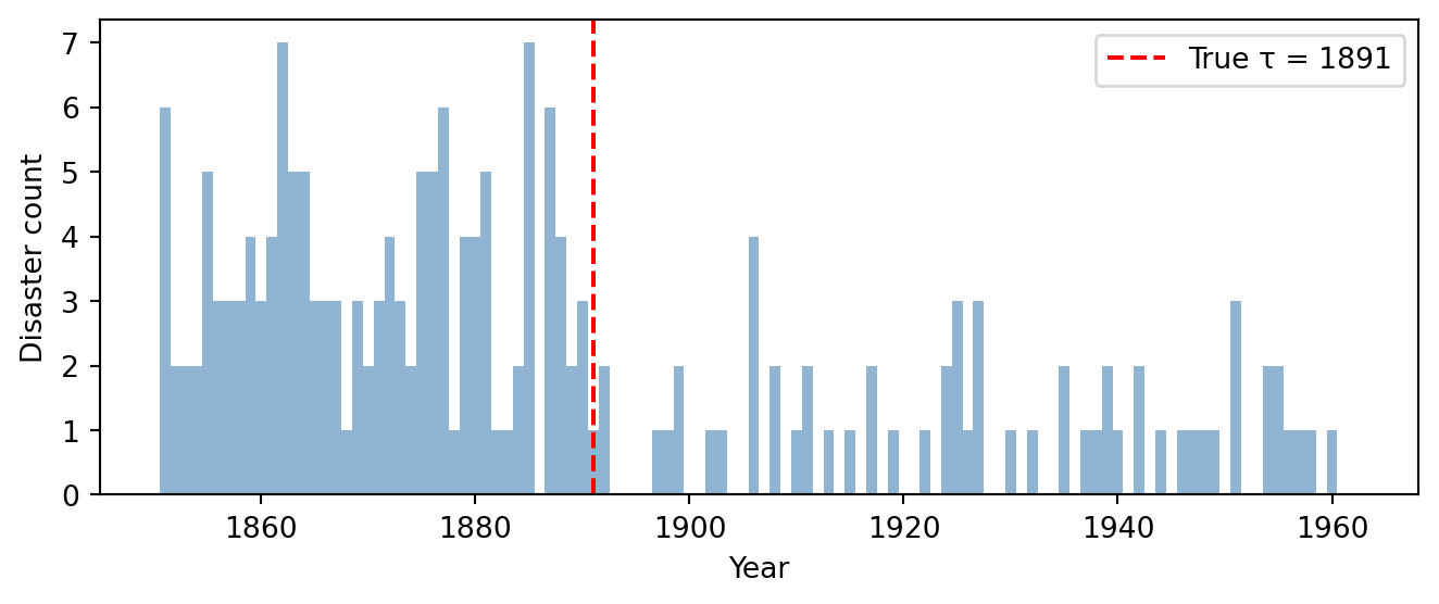 When did the disaster rate change? We want a posterior distribution over the year of transition, not just a point estimate — so that we can quantify our uncertainty.