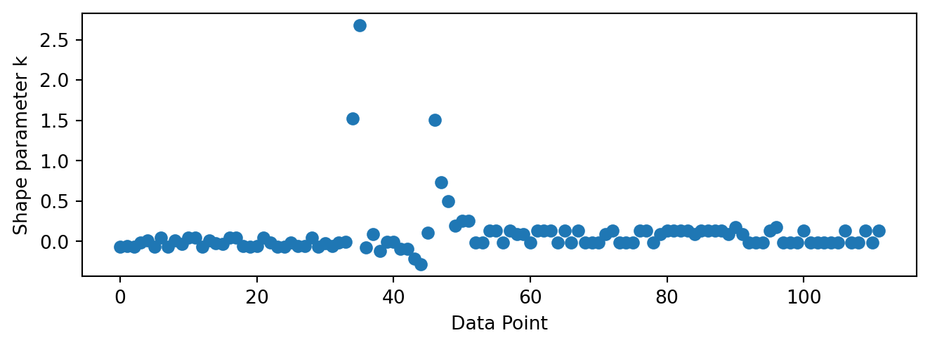 The plot reveals that the problematic observations are clustered around the change-point. This makes intuitive sense: observations near the transition zone are the most informative about \(\tau\), so leaving one of them out shifts the posterior on \(\tau\) significantly. That large posterior shift is exactly what makes the importance-sampling approximation unstable. Observations far from the change-point, by contrast, sit comfortably in one regime or the other and are easy to predict from the remaining data.