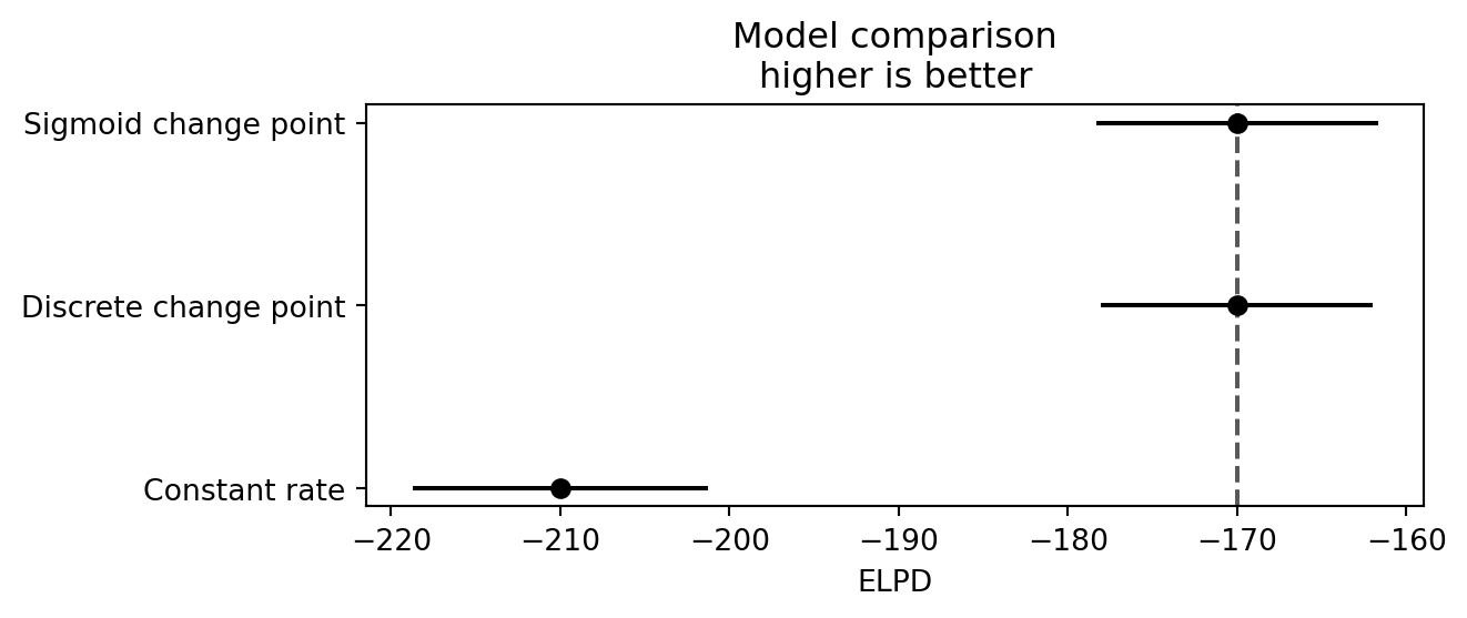 dt_const = az.from_numpyro(mcmc_const, log_likelihood=True)# dt already has log_likelihood from the DataTree built in the sensitivity sectiondt_cp = dtcomparison = az.compare( {"Constant rate": dt_const, "Discrete change point": dt_cp, "Sigmoid change point": dt_sig})comparison