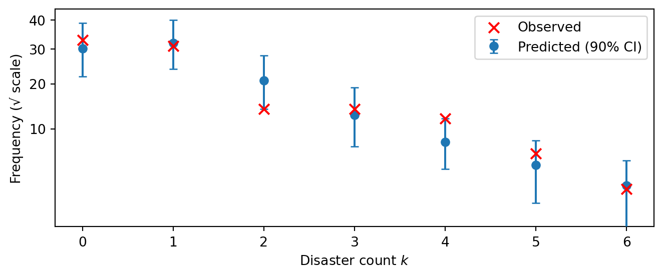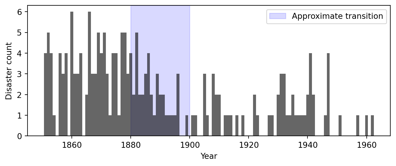 Figure 5.1 shows the raw data. The early decades (1851–1890) show a volatile but clearly elevated rate, typically 2–5 disasters per year with occasional spikes to 6. Somewhere between 1880 and 1900, the pattern changes visibly: the counts drop and stay low for the remainder of the record, with most years seeing 0 or 1 disasters. The shaded region marks this transitional window.