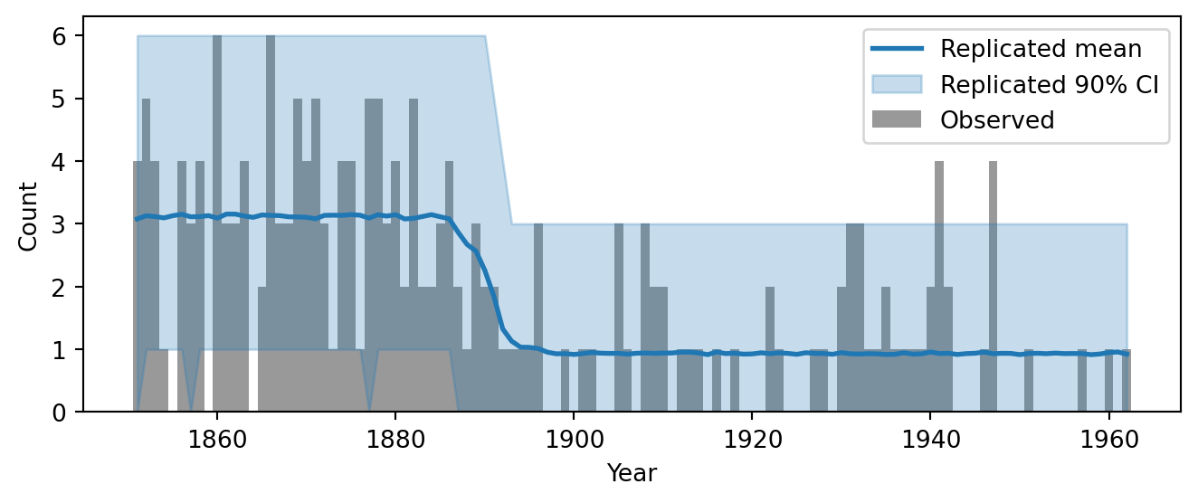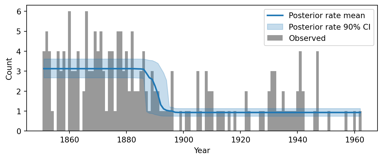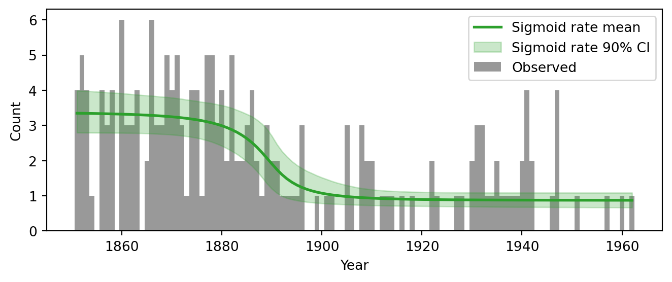 Model comparison via LOO-CV confirmed that both change-point models are clearly favored over a constant-rate baseline. The discrete and sigmoid models achieved similar predictive performance, which is itself informative: the data do not strongly distinguish an instantaneous jump from a gradual transition. This leaves the modeler with a genuine choice. The discrete change-point model directly answers “when did the rate change?” — it gives a posterior distribution over a single switchpoint year. The sigmoid model answers a different but arguably richer question: “what was the shape of the transition?” — it infers not just where the transition is centered (\(\tau\)) but also how gradually it occurred (\(s\)). From a computational standpoint, the sigmoid model is also simpler to fit: all its parameters are continuous, so plain NUTS suffices without the DiscreteHMCGibbs wrapper needed for the discrete \(\tau\). In practice, the sigmoid model is probably the better default for this problem.