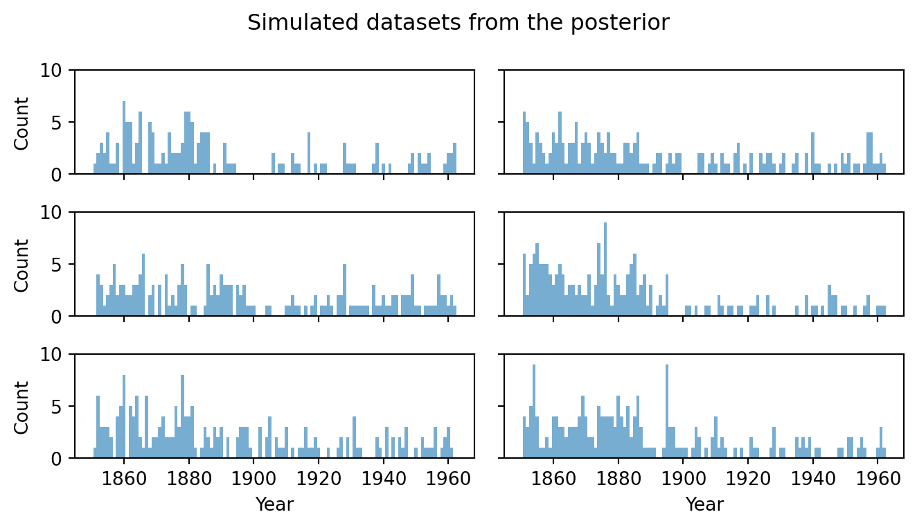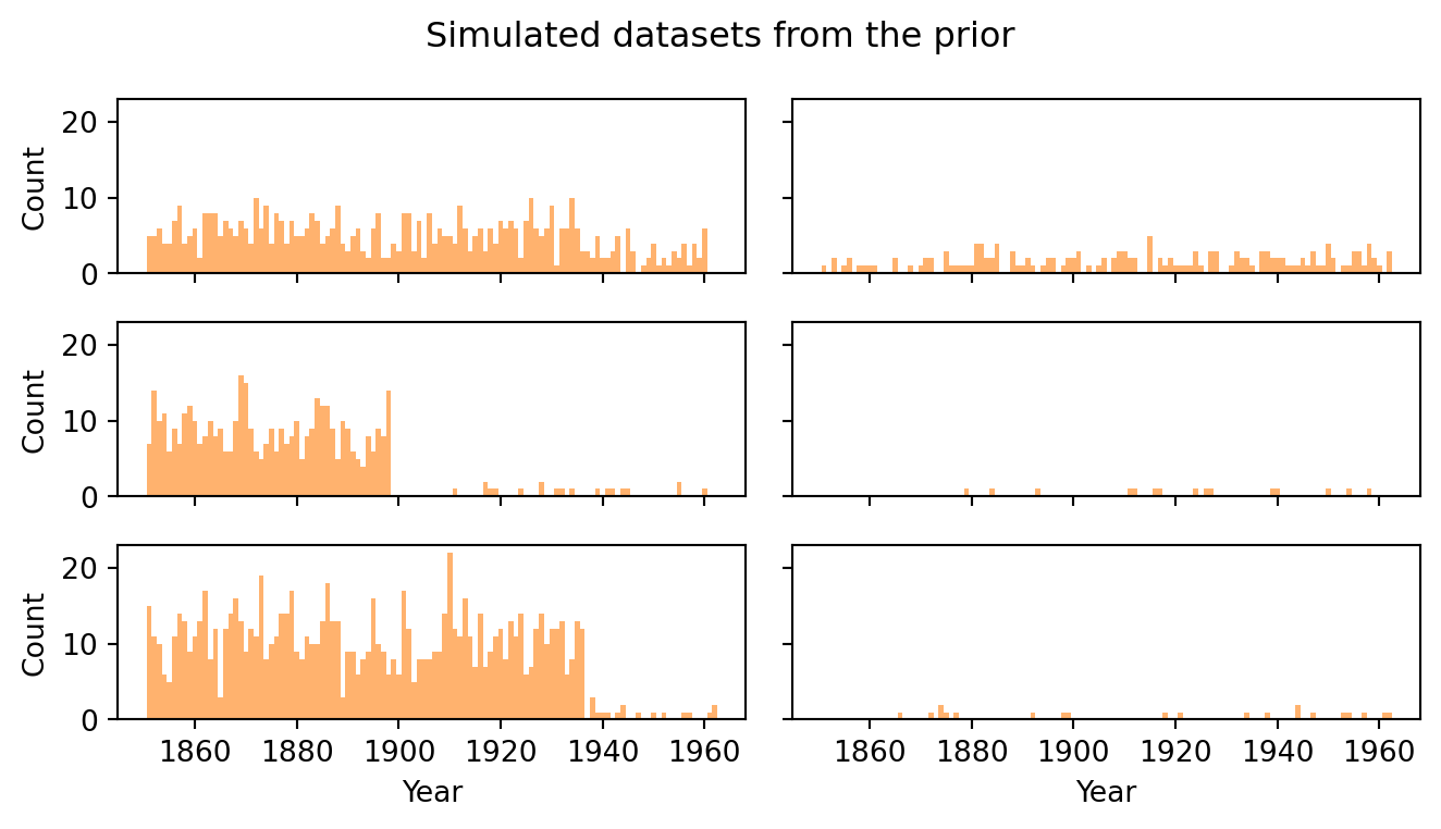 fig, axes = plt.subplots(3, 2, figsize=(7, 4), sharex=True, sharey=True)for i, ax inenumerate(axes.flat): ax.bar(years, prior_samples['obs'][i], color='C1', alpha=0.6, width=1.0) ax.set_ylim(0, max(15, int(prior_samples['obs'][:6].max()) +1))axes[0, 0].set_ylabel("Count")axes[1, 0].set_ylabel("Count")axes[2, 0].set_ylabel("Count")for ax in axes[2]: ax.set_xlabel("Year")fig.suptitle("Simulated datasets from the prior", fontsize=12)plt.tight_layout()plt.show()