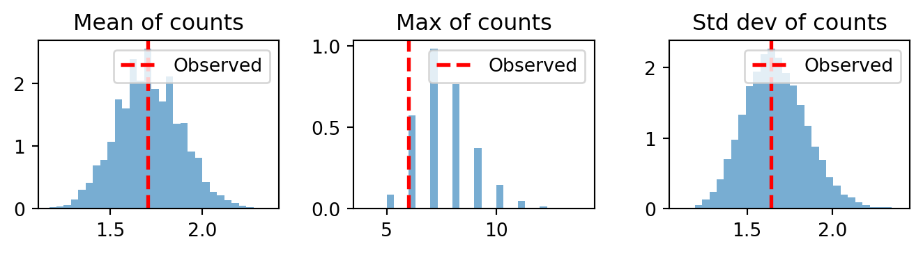 This is the first genuine use of the generative design we built in Section 5.3. Calling Predictive(model, num_samples=..., counts=None) draws parameters from the priors and then simulates observed counts, exercising the full model as a data-generating process.
