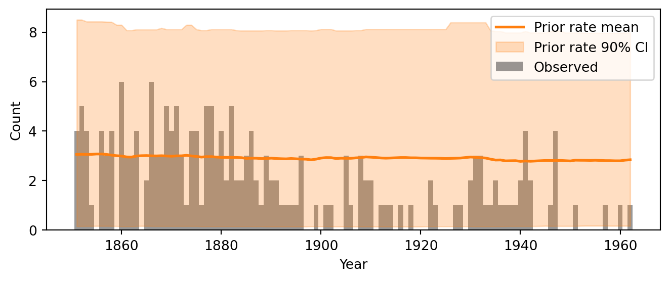 Figure 5.2: Prior predictive check: the mean and 90% credible interval of the prior predictive rate overlaid on the observed data.
