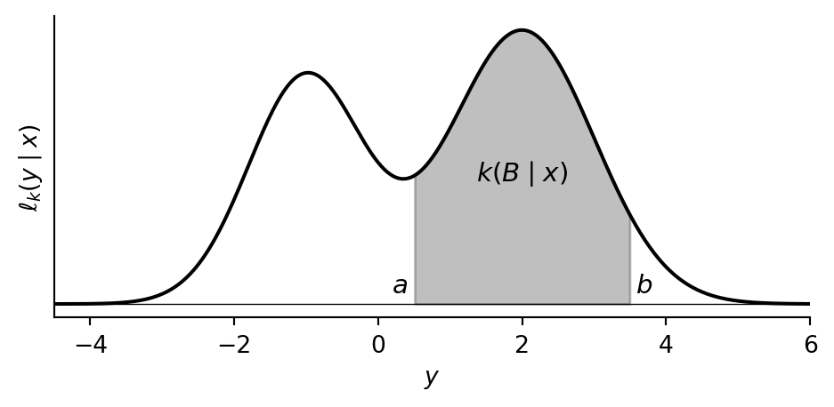 Continuous outputs. Consider a kernel \(k : X \kernel \mathbb{R}\) whose output is a real-valued variable. For each input \(x\), suppose we have a non-negative function \(y \mapsto \ell_k(y \mid x)\) whose graph is a curve over the real line. We think of \(\ell_k(y \mid x)\) as the weight per unit length that \(k\) places near the output value \(y\). The total weight assigned to an event \(B \in \Sigma_Y\) is then the area under this curve above \(B\):