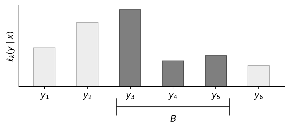 Discrete outputs. In the discrete setting, each output value \(y\) carries a weight \(\ell_k(y \mid x)\), which we can picture as a bar of that height. The total weight on an event \(B\) is the sum of bar heights: