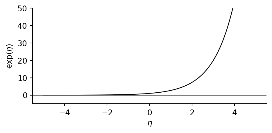 Exponential. The exponential function \(\exp(\eta) = e^{\eta}\) maps \(\mathbb{R}\) into \(\mathbb{R}_{>0}\). It is convex and grows rapidly for positive \(\eta\), while approaching \(0\) for negative \(\eta\).