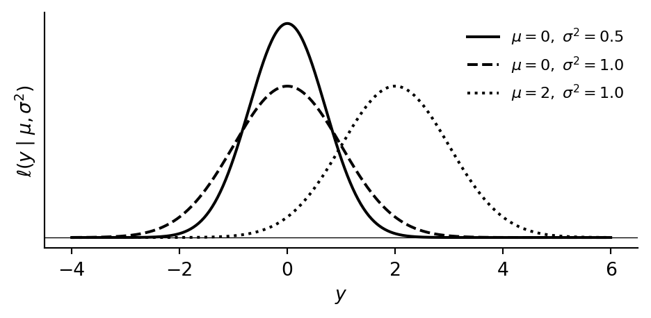 Example 4.5 The Gaussian (or normal) density with mean \(\mu\) and variance \(\sigma^2\) is \[ \ell(y \mid \mu, \sigma^2) = \frac{1}{\sqrt{2\pi\sigma^2}} \exp\!\Bigl(-\frac{(y - \mu)^2}{2\sigma^2}\Bigr). \] We write \(\mathsf{Normal}(\mu, \sigma^2)\) for the probability measure with this density — its graph is the familiar bell curve, centered at \(\mu\) with spread controlled by \(\sigma^2\). Since the total area is 1 for every choice of \((\mu, \sigma^2)\), varying the inputs defines a probability kernel \(k : \mathbb{R} \times \mathbb{R}_{>0} \kernel \mathbb{R}\).