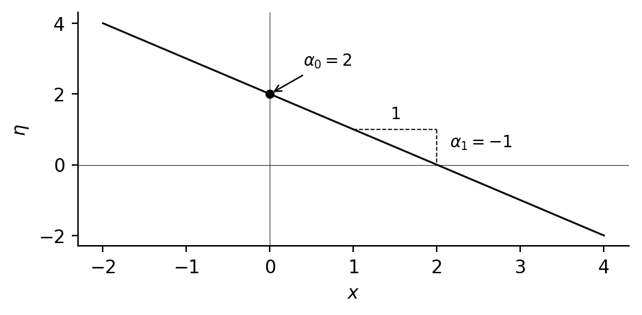 The output is a bell curve centred at \(\eta\). The variance \(\sigma^2\) controls the spread and does not depend on the inputs, so it represents irreducible noise. Each coefficient \(\alpha_j\) tells us how much a one-unit increase in \(x_j\) shifts the centre of the output distribution. In particular, \(\mathbb{E}[Y \mid x] = \eta\), so the inputs affect the output additively: changing \(x_j\) by \(\Delta\) shifts the expected output by \(\alpha_j \Delta\).
