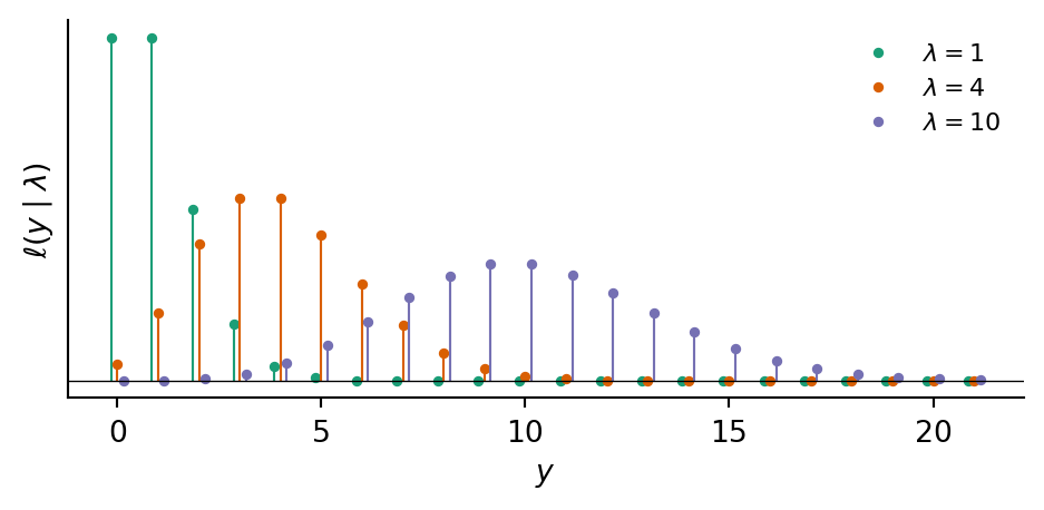 Poisson (\(Y = \mathbb{N}_0\)). The Poisson family is parameterised by a rate \(\lambda > 0\), with mass function \[ \ell(y \mid \lambda) = \frac{e^{-\lambda}\,\lambda^{\,y}}{y!}. \] It models counts of independent, memoryless events occurring at a fixed rate, for example arrivals, mutations, or photon hits. It arises as the limit of a Binomial distribution with many trials and a small per-trial probability. The mean and variance both equal \(\lambda\).