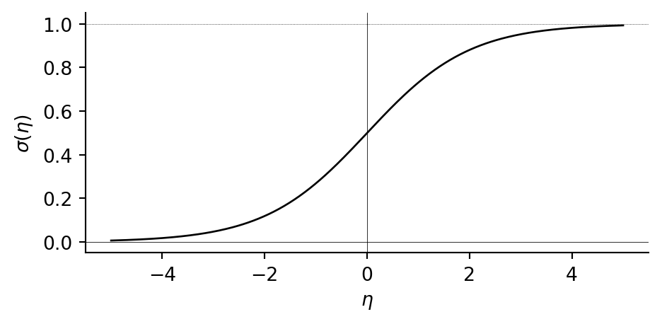 Sigmoid. The sigmoid function \(\sigma(\eta) = \frac{1}{1 + e^{-\eta}}\) maps \(\mathbb{R}\) into the open interval \((0,1)\). It is an S-shaped curve, centred at \(\eta = 0\) where \(\sigma(0) = \tfrac{1}{2}\), and it saturates towards \(0\) and \(1\) for large \(|\eta|\).