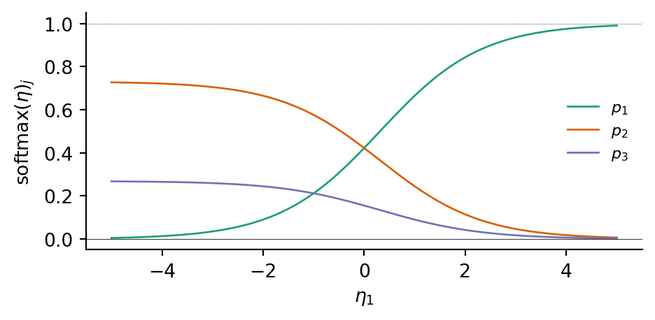 Softmax. The softmax function maps \(\mathbb{R}^K\) into the probability simplex \(\Delta^{K-1} = \{(p_1, \ldots, p_K) \in [0,1]^K : p_1 + \cdots + p_K = 1\}\): \[ \mathrm{softmax}(\eta_1, \ldots, \eta_K)_j = \frac{e^{\eta_j}}{\sum_{k=1}^K e^{\eta_k}}. \] The sigmoid is the special case with \(K = 2\).