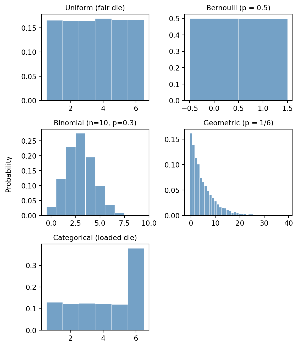 Before tackling the puzzles, we set up a basic sampling toolkit. Each distribution below is a building block for the simulations that follow. The goal is to get comfortable generating random samples in Python. We recommend using torch.distributions for sampling, matplotlib for general plotting, and seaborn for statistical plots like histograms. You can find a short tutorial on using PyTorch for sampling in the Appendix.