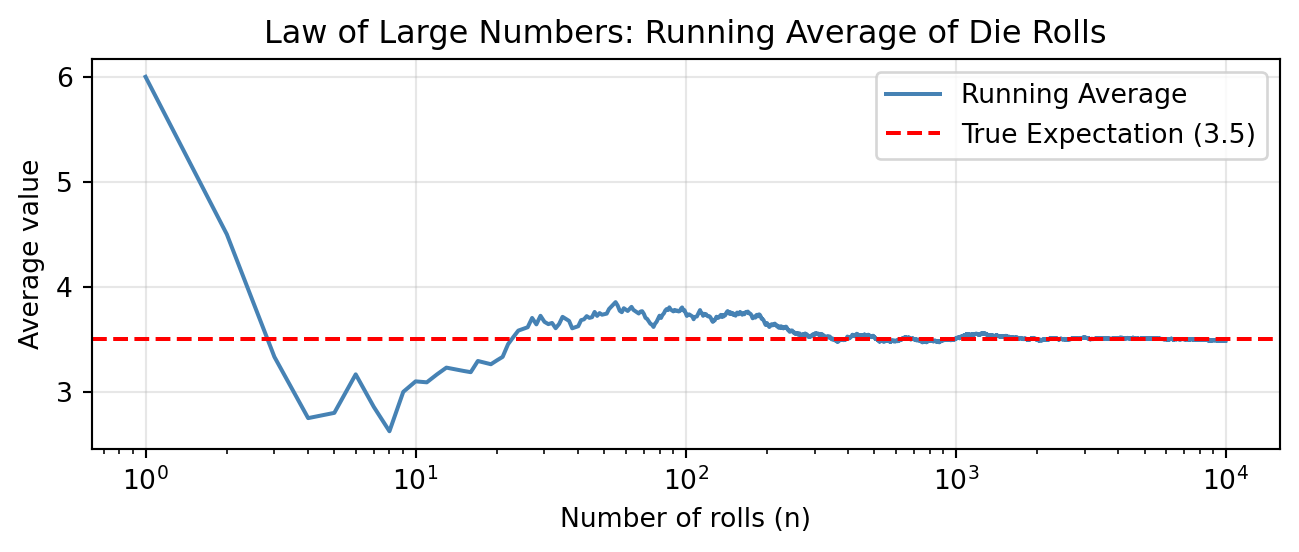 If you roll a fair die many times and average the results, you will get a number close to \(3.5\). This is intuitive: each face appears roughly \(1/6\) of the time, so the average is approximately