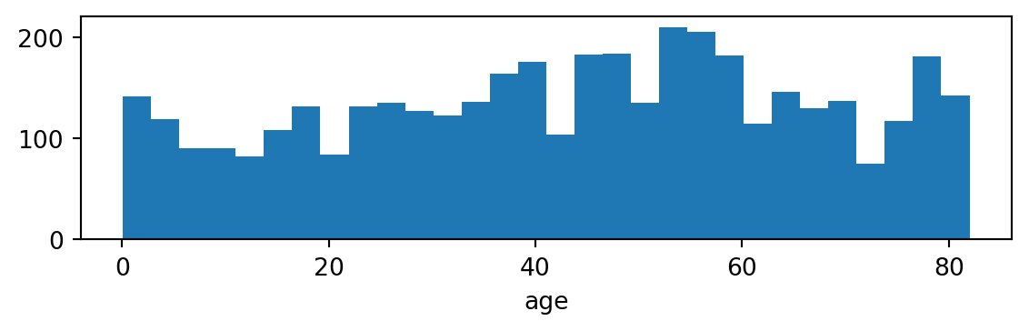 import matplotlib.pyplot as pltfig, ax = plt.subplots(figsize=(6, 2))ax.hist(raw["age"].dropna(), bins=30)ax.set_xlabel("age")plt.tight_layout()plt.show()